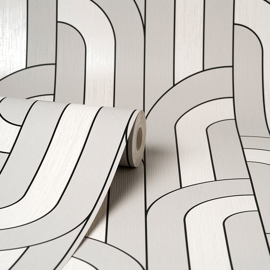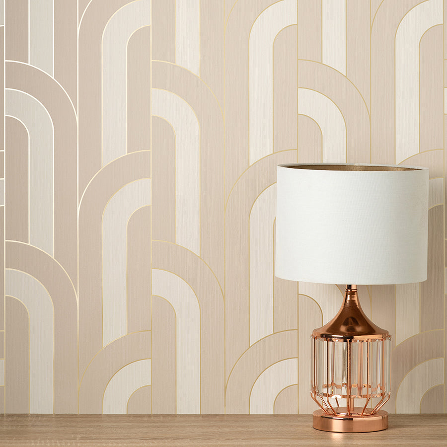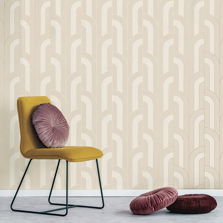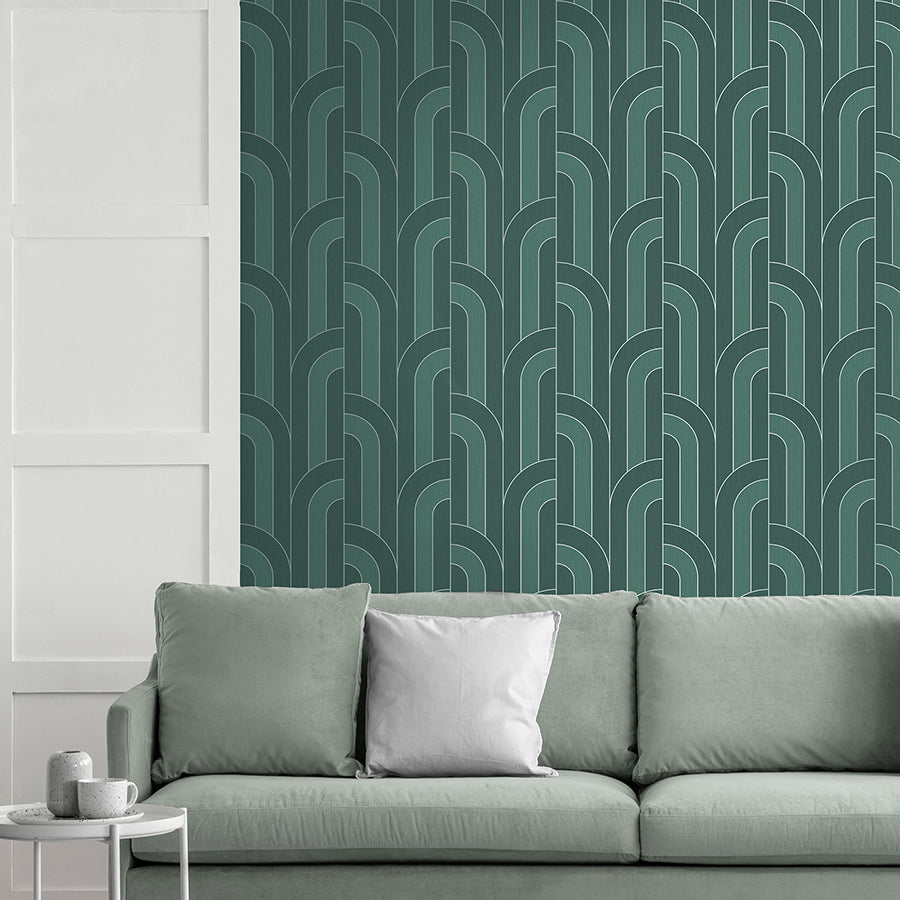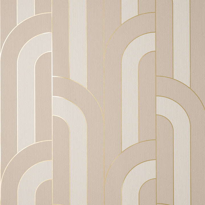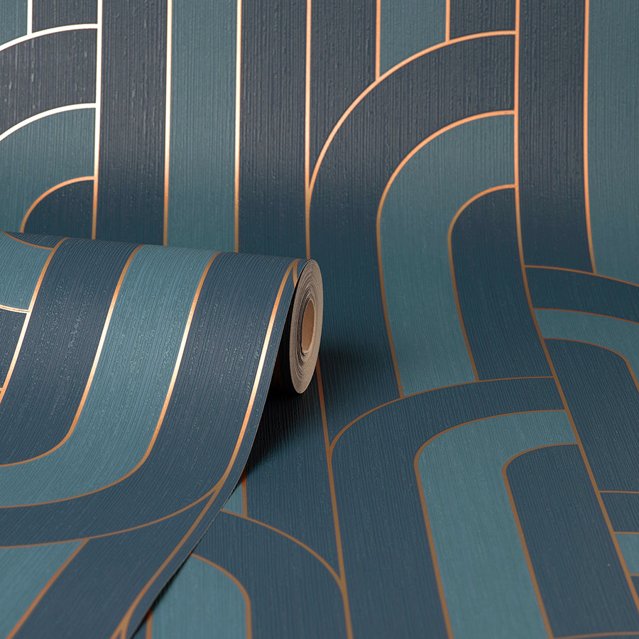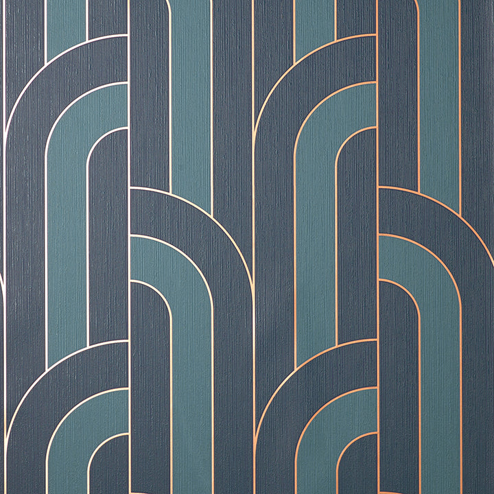 excellence meets modern styling in this chic wallpaper! Columns of offset arches alternate between two shades of blue, each section outlined in metallic gold for a subtle touch of glamour.