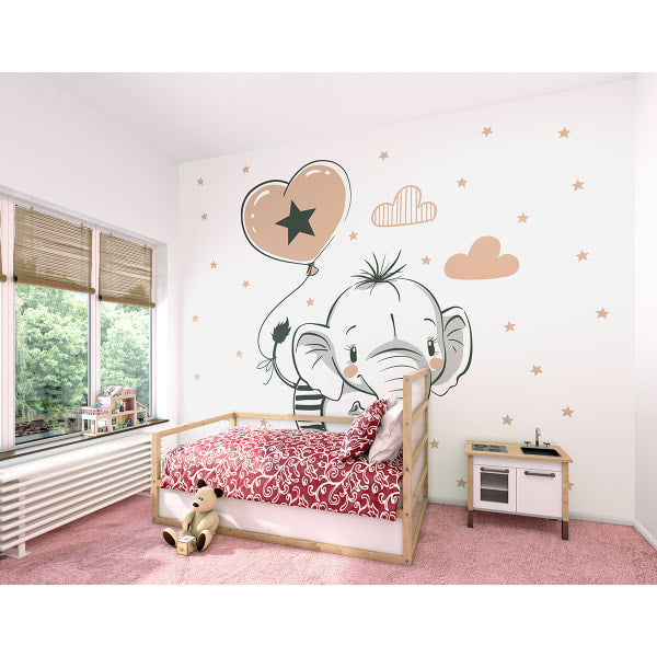 A sweet baby elephants greets you with a heart-shaped balloon tied to its tail. Set against a white backdrop and accented with peach details - including tiny stars and puffy clouds - this wall mural is a great addition to a kids room. Balloon Cartoon Elephant Wall Mural comes on 6 panels