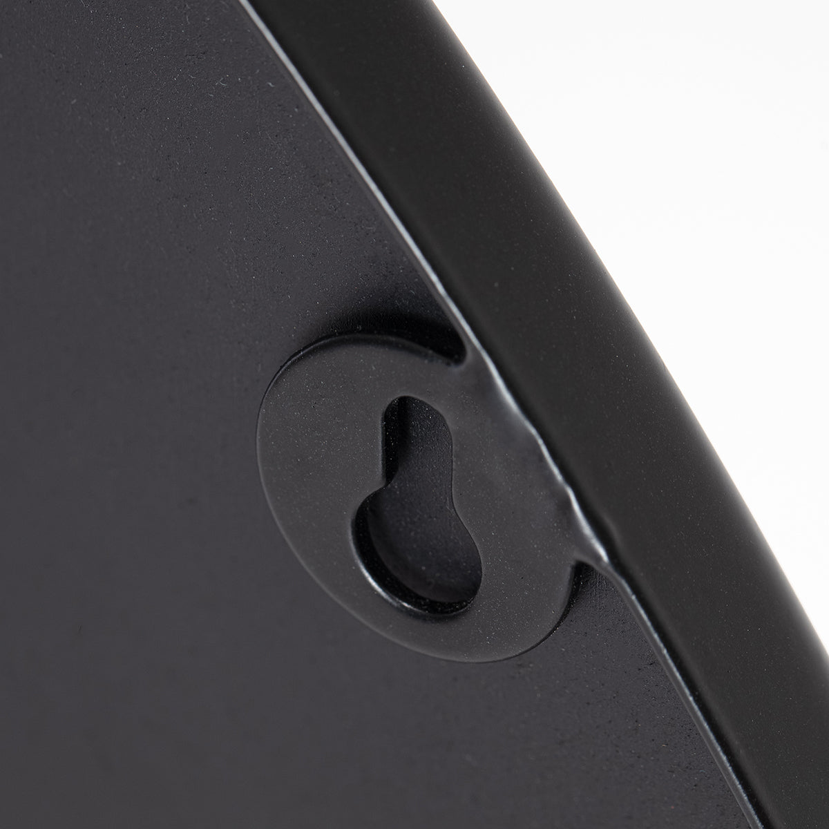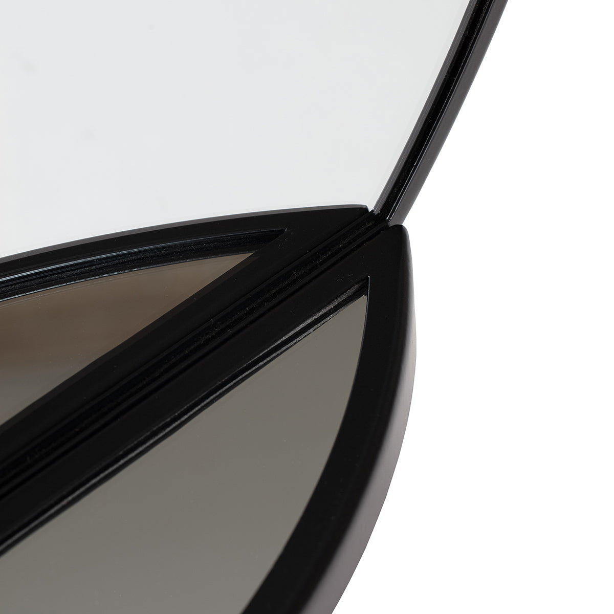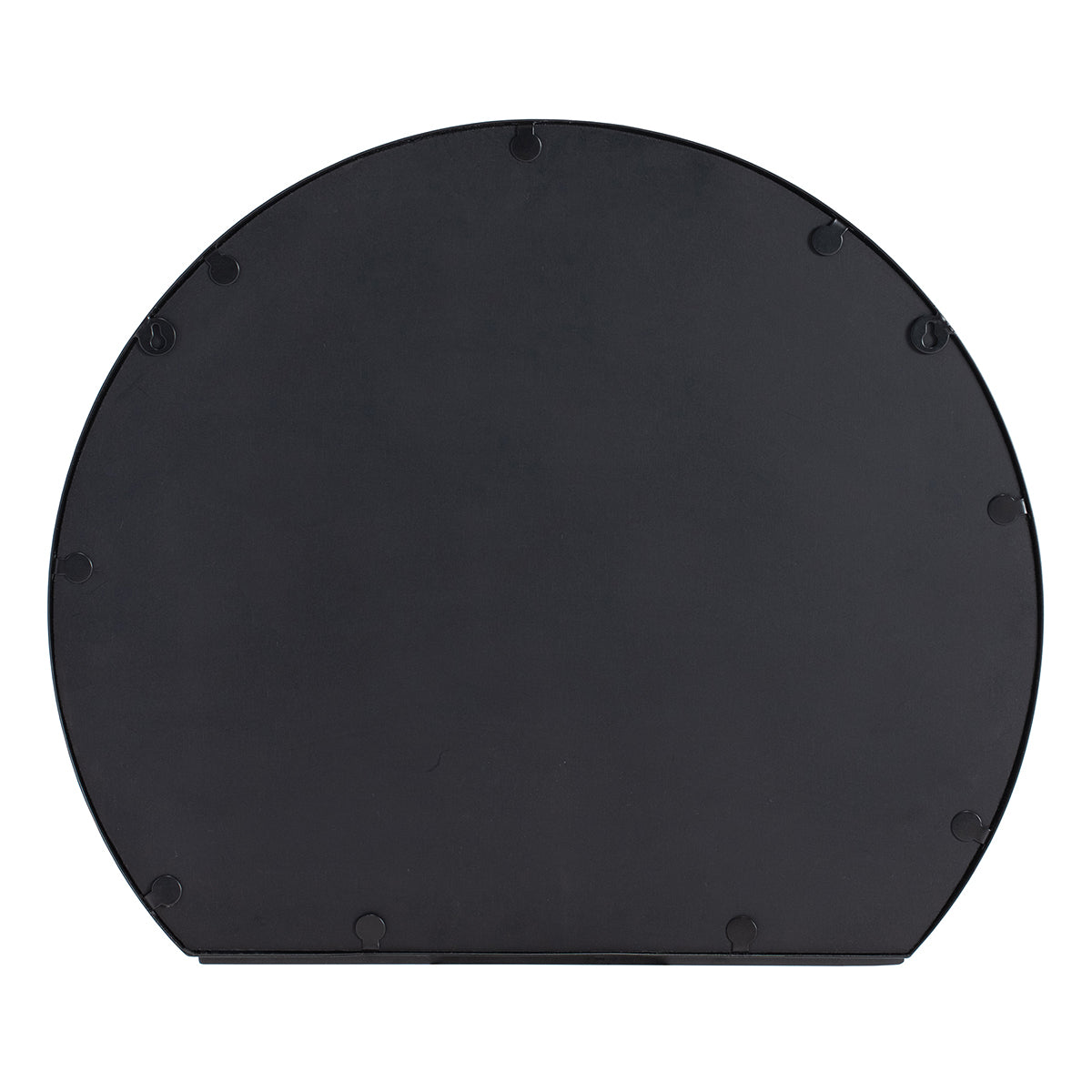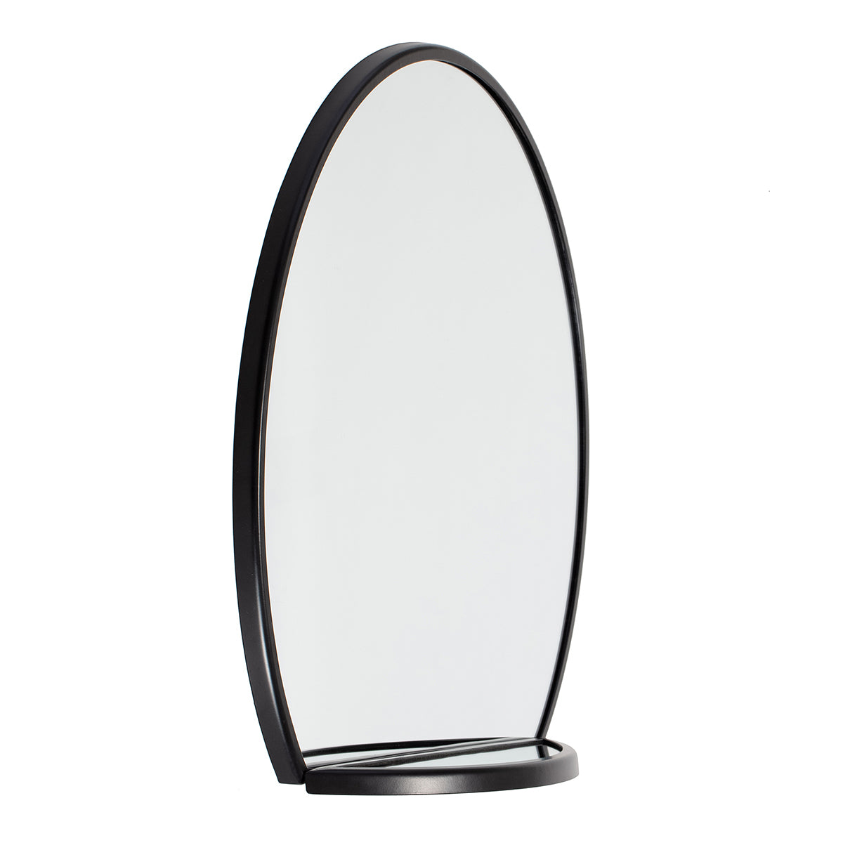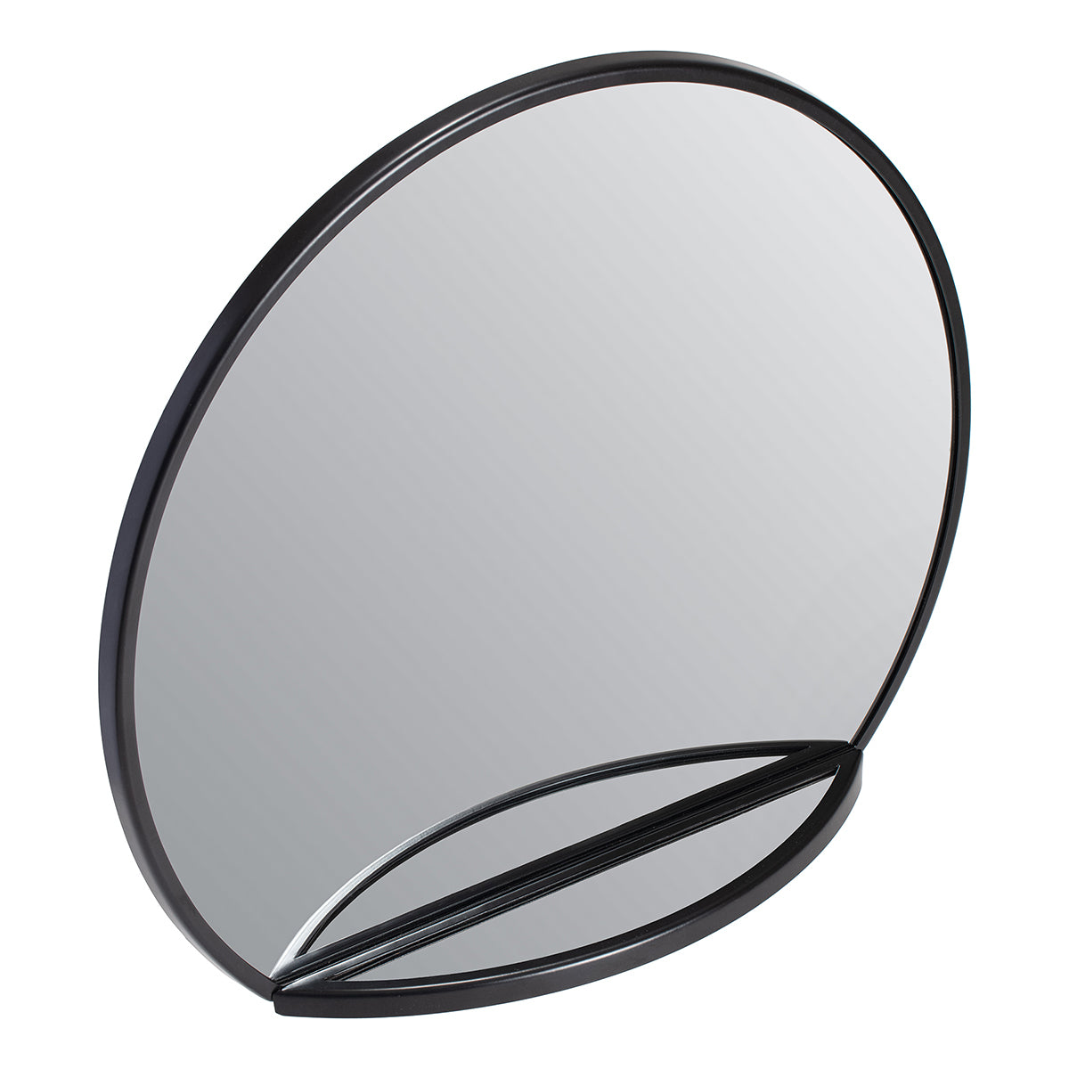 - This sleek circular mirror brings functionality and modern flair to your home! Framed in black, the delicate shelf completes the mirrored circle and is perfect for stashing small personal items, plants, or decor. Evi Black Shelf mirror measures 20.5-in long by 24-in wide.