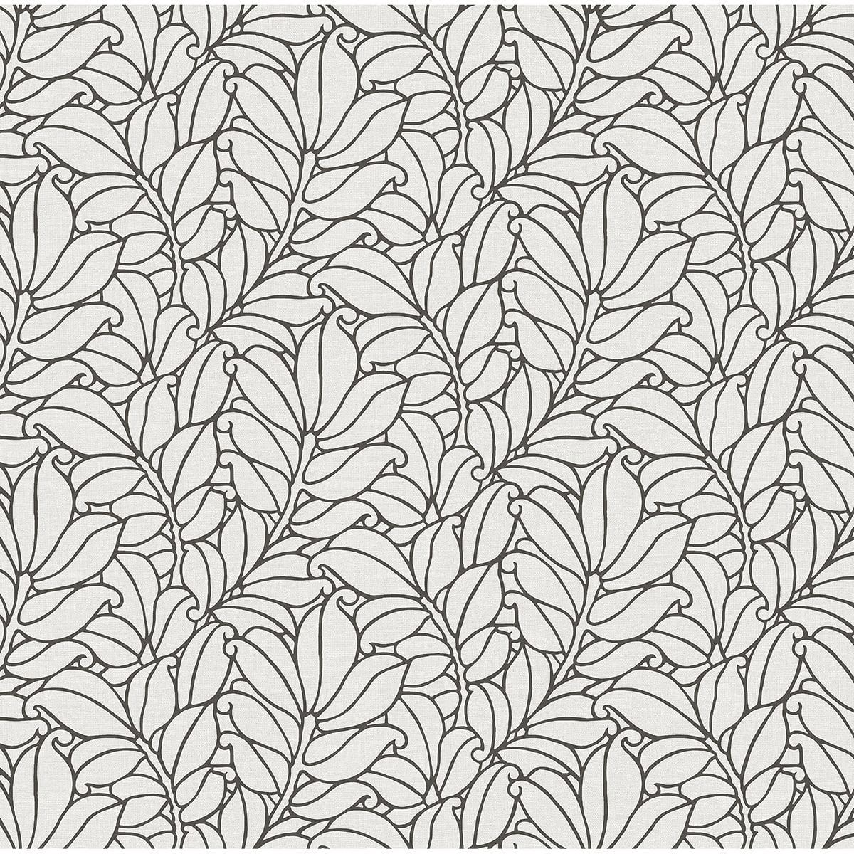 Bring simple and whimsical elegance to your walls with this botanical design. Branches of plump, curling leaves are outlined in bold black lines against a white faux linen backdrop. Coraline is an unpasted, non woven backed vinyl wallpaper.
