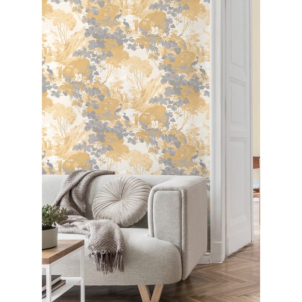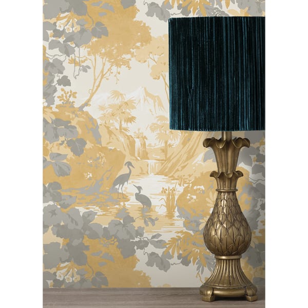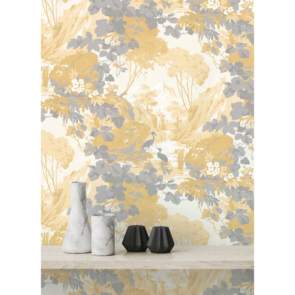 Enjoy the classic elegance of a botanical design with a modern twist. A mountain lagoon visited by graceful cranes is illustrated in watercolor yellows and greys. Eden is an unpasted, non woven wallpaper.