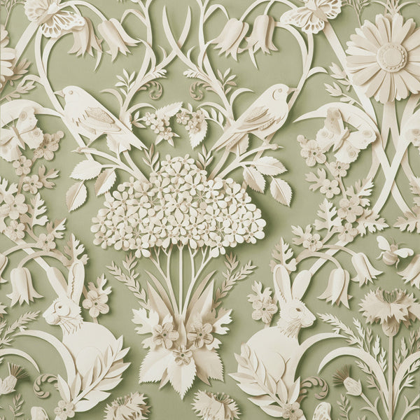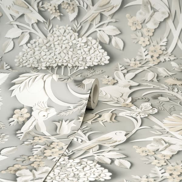 This elegant yet whimsical woodland wallpaper will add a hint of springtime to your interiors. The birds and bunnies sit amidst wildflowers, the flora and fauna seemingly a 3D collage of white papers against a light grey backdrop. Fae is an unpasted, paper wallpaper.