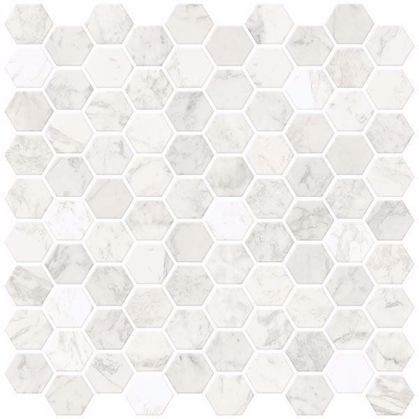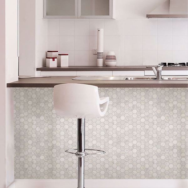 Get the look of an intricate tile backsplash with these peel and stick panels! The small hexagon tiles have the look of classic Carrara marble. Hexagon Marble Peel and Stick Backsplash contains 4 pieces on 4 sheets that measure 10 x 10 inches.