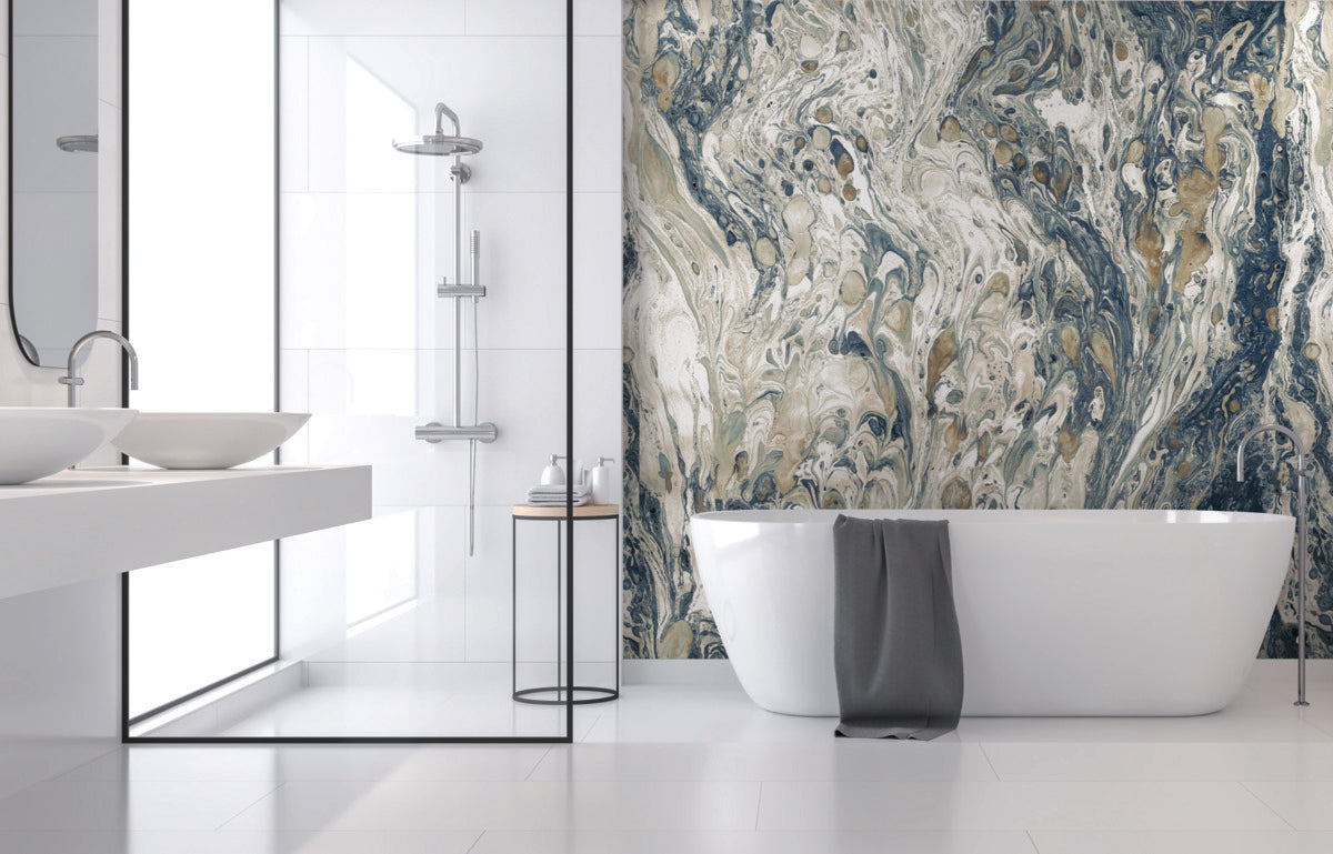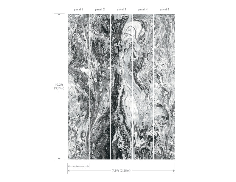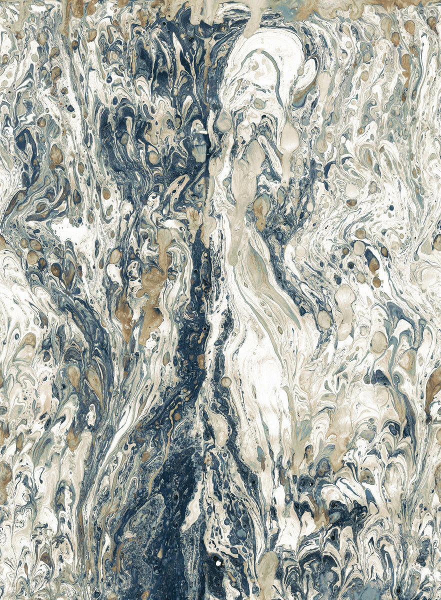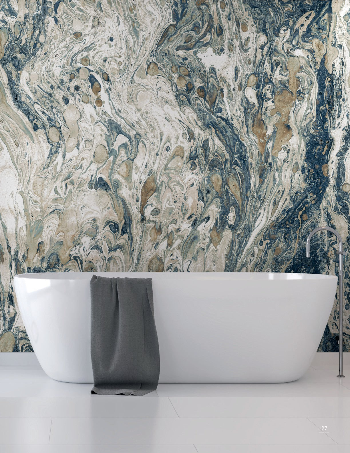 Inspired by ancient bookbinding techniques, Watermark Mural’s floating colors create a marbled, modern abstraction.